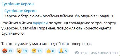 За даними Суспільного, снаряди влучили у зупинку громадського транспорту у центрі міста, є загиблі й поранені.