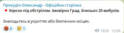 Російські війська обстрілюють Херсон, попередньо – з РСЗВ Град. Про це 21 лютого повідомив голова Херсонської обласної військової адміністрації Олександр Проскудін.