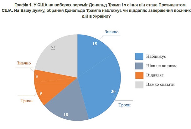 Майже половина опитаних українців (45%) вважають, що перемога Дональда Трампа на президентських виборах у США наближає мир. Поо це свідчать результати опитування Київського міжнародного інституту соціології, опубліковані в п’ятницю, 27 грудня.