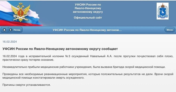 Російський опозиційний політик Олексій Навальний помер у ВК-3 Полярний вовк у селищі Харп Ямало-Ненецького автномного округу РФ. Про це в п’ятницю, 16 лютого, повідомило управління федеральної служби виконання покарань Росії у ЯНАО.