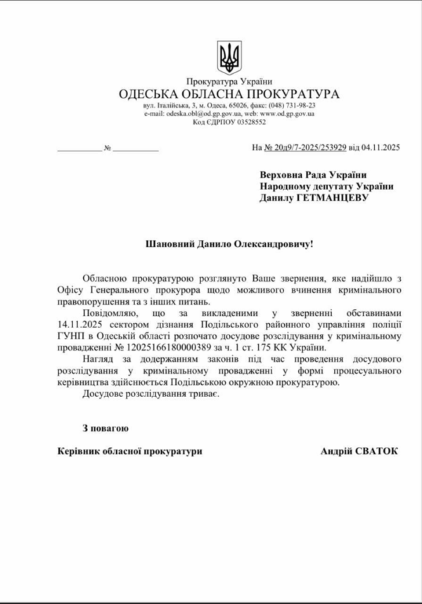 Як зазначено в документі, за викладеними у зверненні обставинами 14 листопада 2025 року слідчі Подільського районного управління поліції ГУНП в Одеській області розпочали кримінальне провадження №12025166180000389 за ч. 1 ст. 175 Кримінального кодексу України (невиплата заробітної плати, стипендії, пенсії чи інших установлених законом виплат).