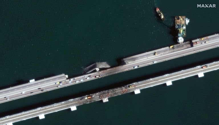 Нині на Кримському мосту відбувається ремонт. Відповідні кадри опублікувала американська аерокосмічна компанія Maxar Technologies.