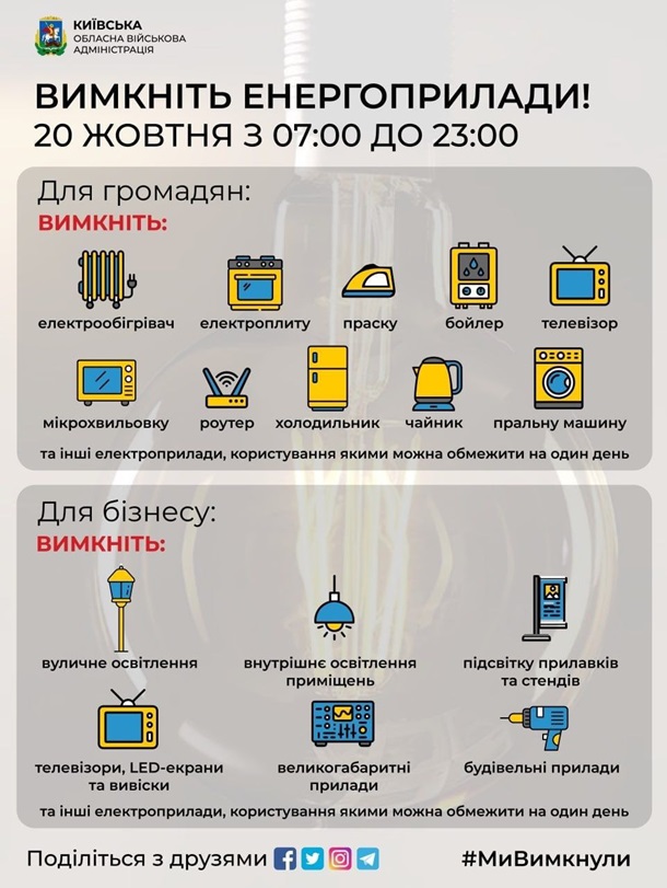 У низці регіонів України у четвер, 20 жовтня, вводяться обмеження щодо енергоспоживання з метою економії.