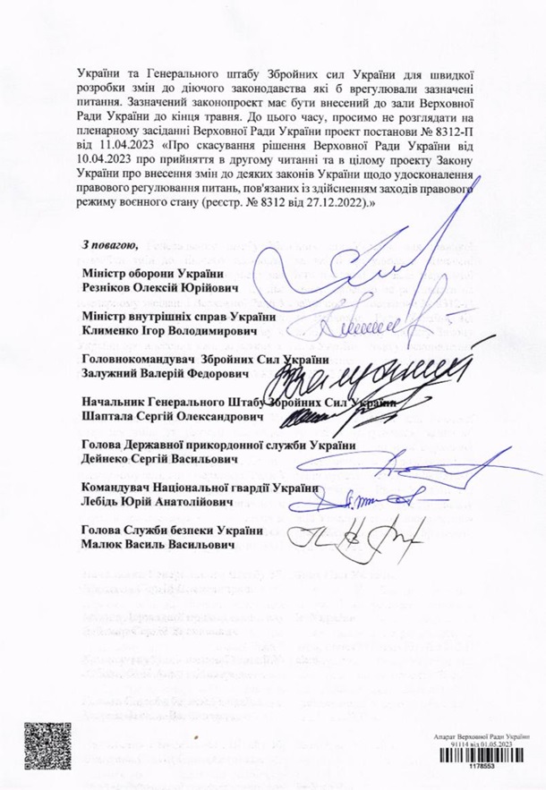 У листі, який підписали міністр оборони Олексій Резніков, головнокомандувач ЗСУ Валерій Залужний, начальник Генштабу ЗСУ Сергій Шаптала, міністр внутрішніх справ Ігор Клименко, голова Держприкордонслужби Сергій Дейнеко, командувач Нацгвардії Юрій Лебідь, голова СБУ Василь Малюк, закликають відкласти розгляд проєкту постанови із цією правкою.