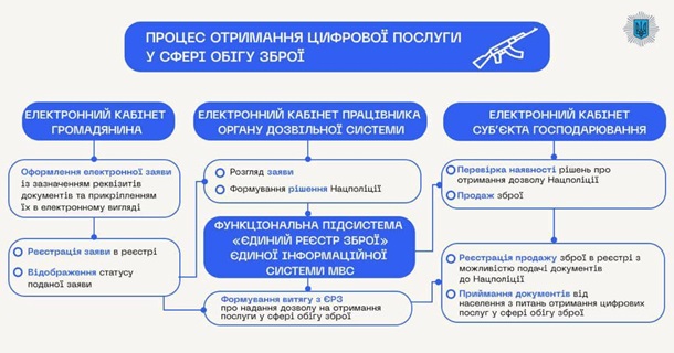 Єдиний реєстр зброї передбачає створення електронних кабінетів. Тож українці зможуть отримати послугу, не виходячи з дому, без відвідування органу Нацполіції, шляхом подачі документів через Єдине вікно громадянина або у магазині з продажу зброї.