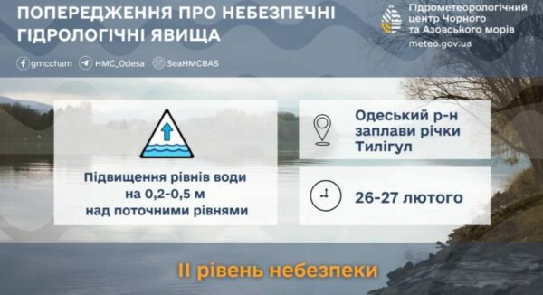 26-27 лютого внаслідок сніготанення, впливу антропогенних факторів та заростання русла і заплави річки Тилігул, в районі міста Березівка очікується подальше зростання рівнів води на 0.2-0.5 м над поточними рівнями, з утриманням води на заплаві. Про це попереджає Гідрометцентр Чорного та Азовського морів.